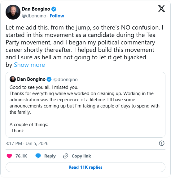 Former FBI Deputy Director Dan Bongino posted a lengthy statement on the X platform a day after leaving his job in a bid to reconnect with his fans as he transitions back to civilian life. “Let me add this, from the jump, so there’s NO confusion,” the post began.