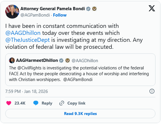 Attorney General Pam Bondi noted as well: “I have been in constant communication with @AAGDhillon today over these events which @TheJusticeDept is investigating at my direction. Any violation of federal law will be prosecuted.”