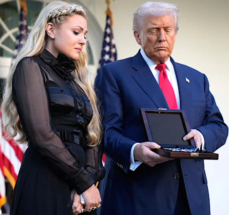 After receiving the medal from the president, Erika Kirk, Charlie’s widow, delivered a heartfelt tribute that blended grief with gratitude, transforming the ceremony into a celebration of both her husband’s life and his unwavering faith in the ideals of liberty.